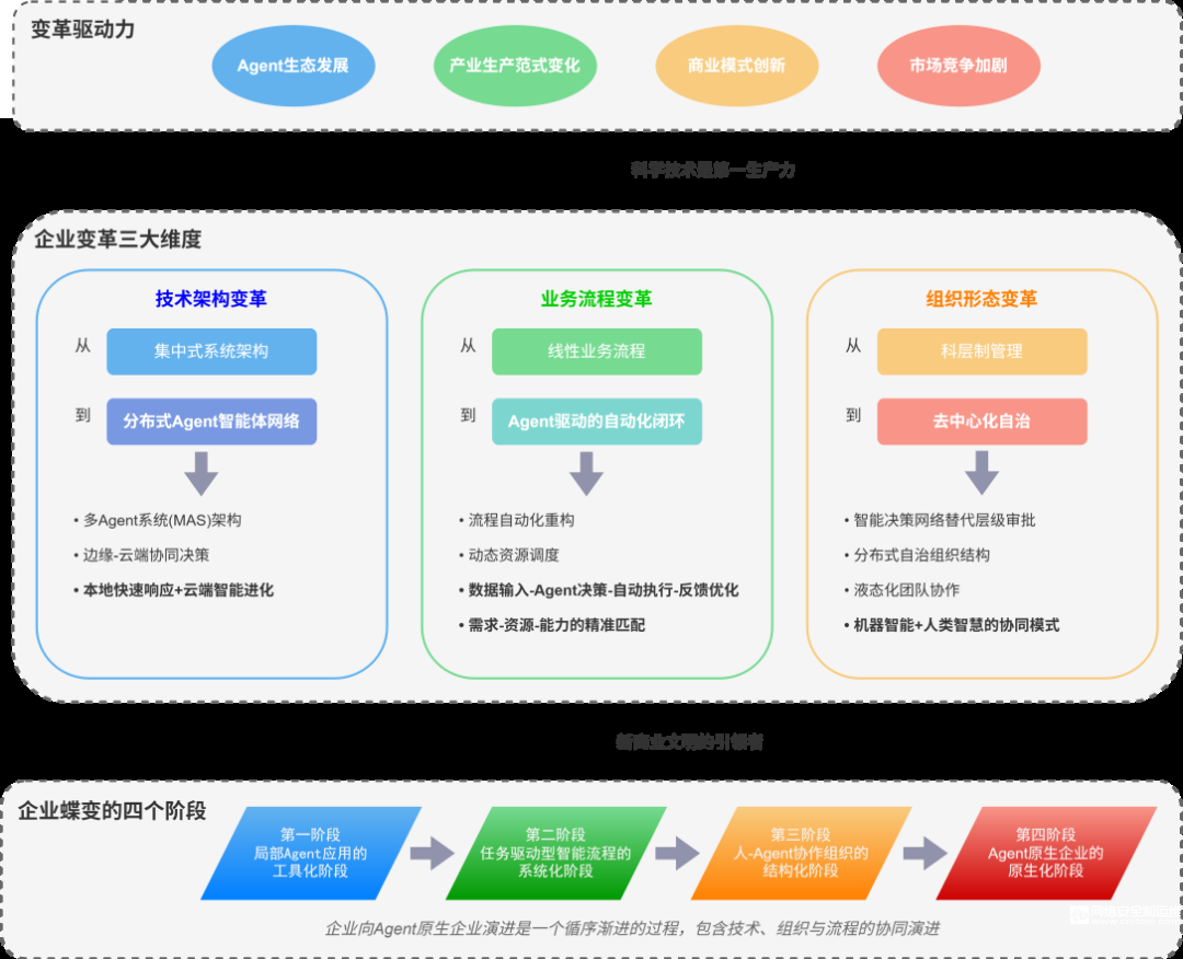 为顺应Agent技术驱动的产业生态迭代与生产范式、商业模式革新,通过创新应对市场竞争,并能在其中占据竞争高地,企业在管理模型、资产配置方式以及生产工具上必须做出改变——科学技术为第一生产力,通过技术架构、业务流程与组织形态的深度变革,向Agent原生企业演进。