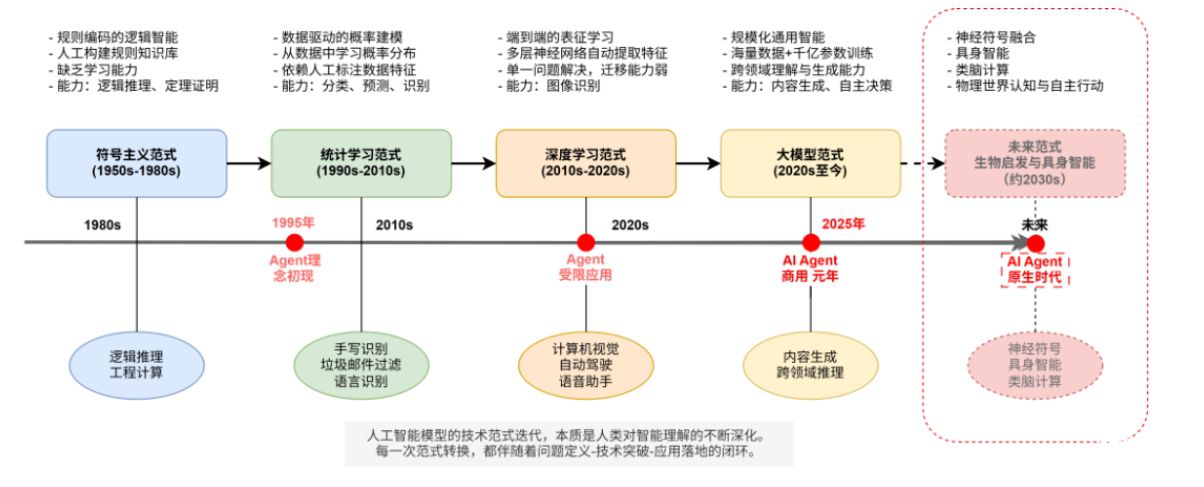AI技术范式迭代,本质是人类对“智能”理解的不断深化。每一次范式转换,都伴随着“问题定义-技术突破-应用落地”的闭环。尤其是,大模型技术在从专用智能到通用能力的跨越的同时,也实现了Agent从被动执行到主动决策的蜕变。