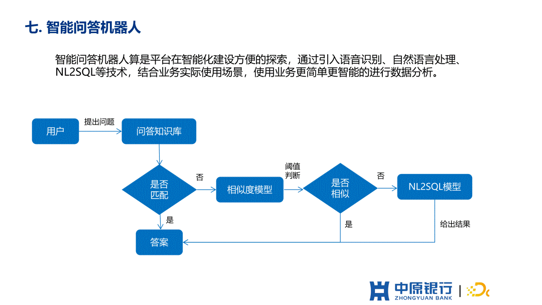 整个流程就是用户在平台上提出问题后,后台在问答知识库进行匹配,如果匹配上的话直接会给出答案,如果没有匹配上就会有经过相似度模型跟其他的问答去进行匹配,看是否是相似的问题,通过阈值判断,如果超过阈值,就认为它们是相似的问题,就可以返回相应的答案,如果没有,会经过NL2SQL模型去构建对应的查询SQL给出相应的结果。