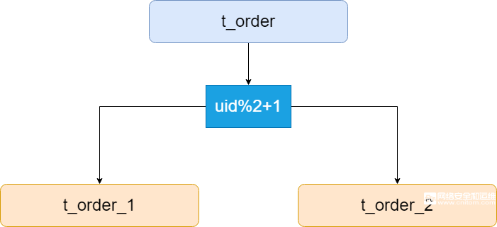 假设将订单表根据hash(uid%2+1)拆分成了两张表,如下图: