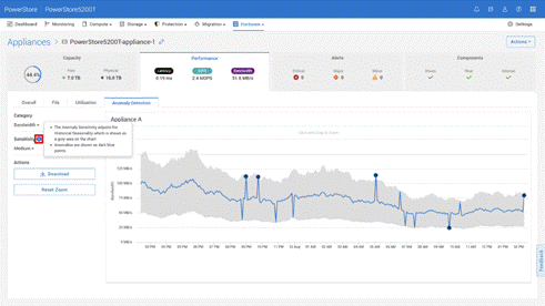 此外,PowerStore 的异常检测 (Anomaly Detection) 功能也得到强化,可为用户提供设备运行的可视化监控与异常报告,并基于历史行为自动标记异常点,帮助快速识别性能异常,及时采取优化措施,确保系统始终保持稳定高效的运行状态;用户还可根据实际需求调整检测灵敏度,实现更精细的性能监控与分析。该功能现已覆盖带宽、总体及读写 IOPS、延迟与 I/O 大小等关键性能指标。