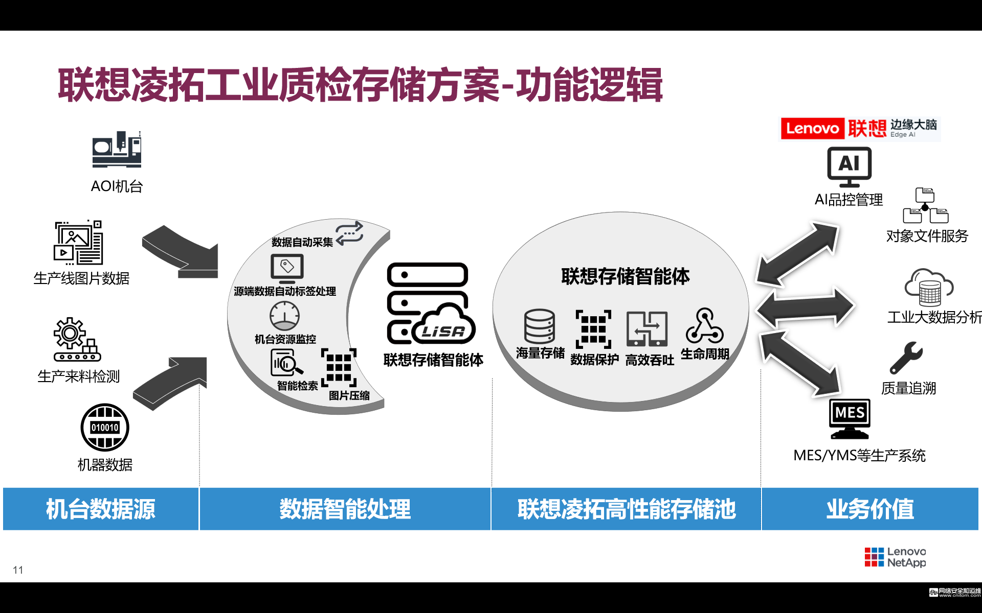 LiSA专注于行业解决方案的整合,例如联想凌拓“救急1110灾备一体化医疗行业解决方案”,以及金融、制造等行业解决方案。本次隆重亮相的制造业智能质检解决方案旨在应对制造业在智能化转型中面临的海量数据管理挑战,为企业提供高效、可扩展、安全可靠的数据基础设施支撑。LiSA也广泛应用于制造业中高精度、高频率的AI场景,覆盖半导体、汽车制造、PCB、光伏、锂电池等多个细分领域。已成功应用于某大型PCB制造企业,管理超过13PB质检数据,构建起覆盖全产线的质量追溯体系。面对产线中每日产生的海量图像与日志数据,LiSA通过统一数据采集、智能压缩处理和多协议互通能力,实现对质检数据的全生命周期管理。其核心优势包括: