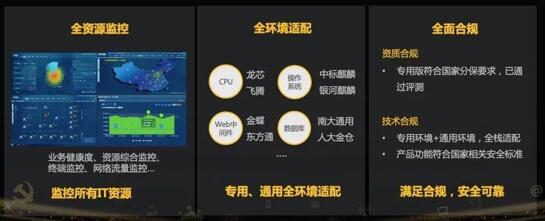 截至目前,锐捷RIILXC版是业内唯一一款可以提供专用平台+通用平台环境全适配、全功能的信息创新运维平台,从资源监控、关键业务、决策分析到服务质效管理的一站式全景可视化解决方案,帮助用户实现平滑过渡。在通用信息设备环境下,实现了对龙芯、申威、飞腾、鲲鹏、海光等芯片,中标麒麟、银河麒麟、深度、中科方德等操作系统,人大金仓、南大通用、武汉达梦为代表数据库,金蝶、东方通、中创为代表中间件等信息技术应用创新环境的全栈适配。在专用信息设备环境运维场景中,锐捷遵循国家最新技术标准专业打造专用计算平台版运维监控系统,实现了专用服务器、专用桌面机、专用交换机、专用安全设备、安全数据库和中间件的集中监管。