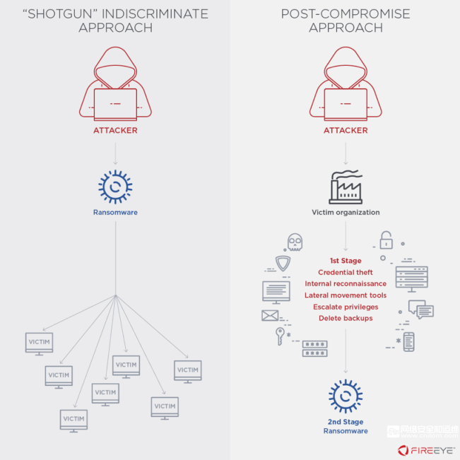 传统的勒索软件攻击方法主要依赖于一种叫做“shotgun”的方法,这种方法包括不加选择地传播恶意软件,以加密来自各种受害者的文件和数据。攻击者使用这种攻击模式的攻击者将向受害者平均勒索500至1000美元,并希望能从尽可能多的人那里得到付款。虽然采用这种方法的早期勒索软件活动通常被认为超出了OT安全的范围,但最近针对整个工业和关键基础设施组织的活动已经转向采用一种更复杂的勒索操作方法。