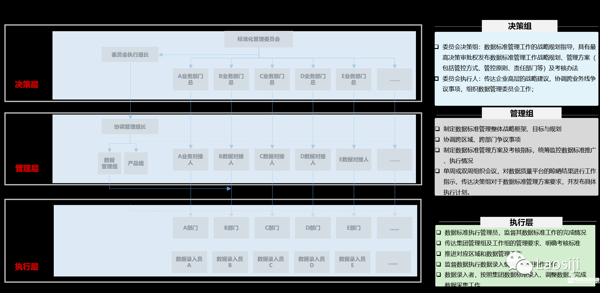 既要明确数据管理组织和数据管理岗位的权责,按照DAMA的数据管理组织理论,一方面需要写清楚企业支撑数据工作的数据管理组织架构,如数据标准化委员会、数据管理指导委员会、数据决策层、数据执行层等,每个数据组织下需要明确数据的岗位,如数据系统管理员、数据负责人,数据协调人、数据管理岗、数据维护岗等,每个岗位的具体职责,需要清晰的说明,也可以配合着流程进一步说明。