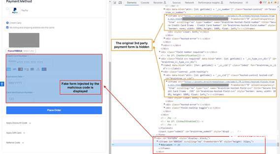 当网站使用的第三方支付服务在第三方 iframe 或外部页面中实现支付表单时,就会出现这种情况。为了绕过这种情况,攻击者会创建一个与原始支付表单非常相似的假表单,并将其覆盖--这是一种越来越流行的技术。这正是变体三中被盗数据的外流方式。