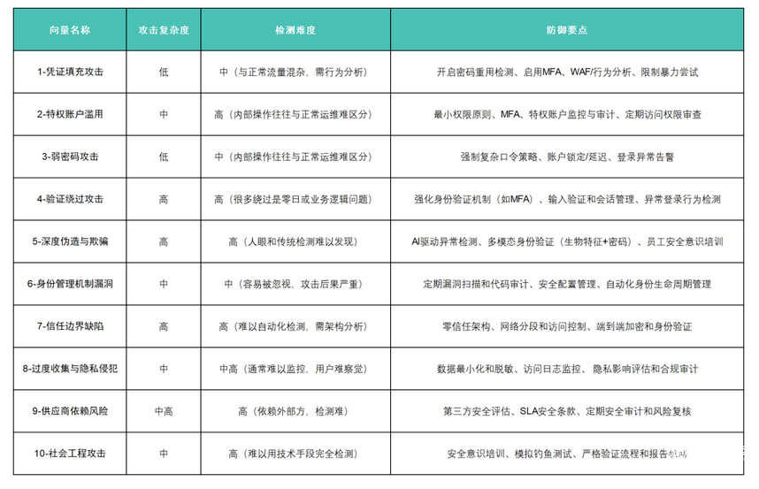 身份攻击向量的本质是:利用身份体系的漏洞或信任机制,以合法或伪造的身份为掩护实施攻击。随着数字化转型中身份边界的不断扩大(用户、设备、应用、API均需身份标识),身份攻击向量将更加复杂多样。
