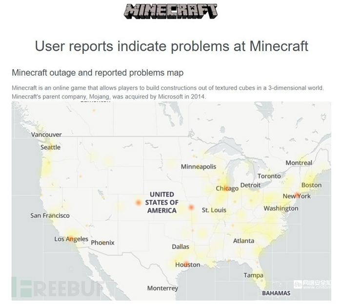 美国地区Minecraft服务中断情况(截图来源:DownDetector)