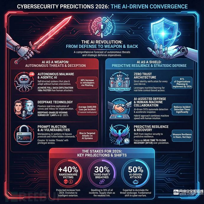 随着人工智能深度融入企业运营和网络犯罪武器库,2026年网络安全格局将呈现自主威胁、身份中心型攻击和加速数字化转型风险的空前交汇。来自顶尖安全公司、政府机构和研究机构的专家们提出了100多项关键预测,标志着AI将从防御工具转变为全球网络战中的主要武器和终极护盾。