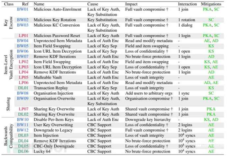 根据利用的密码管理器功能,27种攻击被分为四大类。每个编号对应受影响产品:BW代表Bitwarden,LP代表LastPass,DL代表Dashlane。针对每种攻击,研究标注了根本原因、高级影响(†表示可恢复加密密码)以及所需的客户端交互:同步、定期/用户触发、登录、保险箱打开、加入组织、保险箱共享或点击误导性对话框。